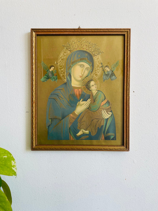 Vintage Our Lady of Perpetual Help Gold Toned Byzantine Style Print Picture - The Virgin Mary & Child Jesus with Archangels Michael & Gabriel - Printed In Italy