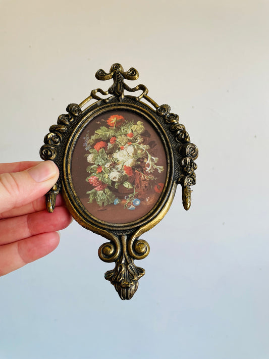 Vintage Ornate Brass Hanging Oval Picture Frame with Bow & Rose Flowers - Floral Print Inside - Made in Italy