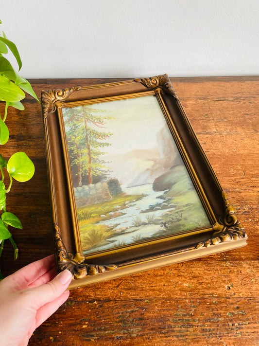 Antique Pastel Painting Picture in Ornate Frame - Landscape Nature Scene of Mountains, Forest & Stream