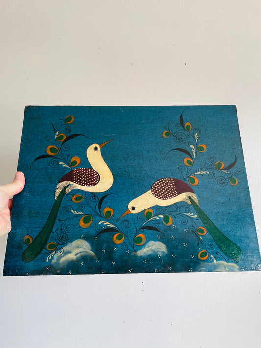 Vintage Original Art Painting Picture of Folk Art Birds on Branches with Blue Background- Artist Signed