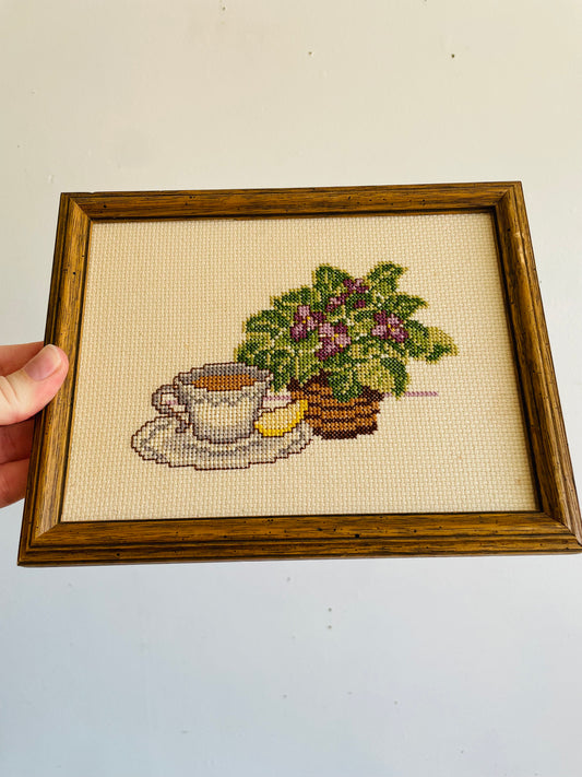 Vintage Adorable Cross Stitch Embroidery Picture - Two Mugs of Coffee with Purple Flowers & Fern Plant Scene