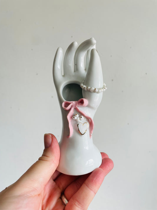 Vintage Porcelain White Hand Bud Vase with Pink Bow & Heart Design