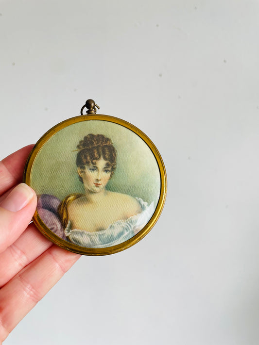 Vintage Miniature Round Victorian Lady Portrait Print Picture in Brass Frame