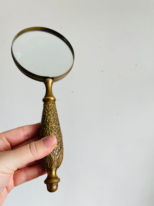 Vintage Solid Brass Magnifying Glass with Embossed Flower Design Handle - Includes Velvet Drawstring Pouch