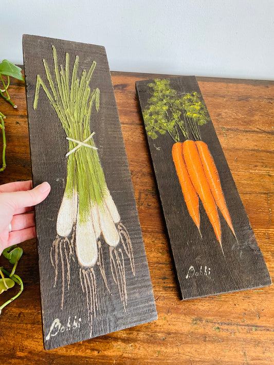 Vintage Original Art Paintings of Vegetables on Wood Boards - Carrots & Green Spring Onions - Artist Signed - Set of 2