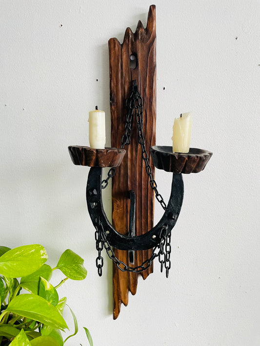 Vintage Gothic Tudor Revival Medieval Castlecore Style Wood & Cast Iron Horseshoe Candle Holder Wall Sconce - Made in Spain