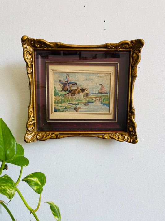 Vintage Petit Point Needlepoint Embroidery Picture of Dutch Windmill & Boat Landscape Scene in Ornate Shadow Box Frame