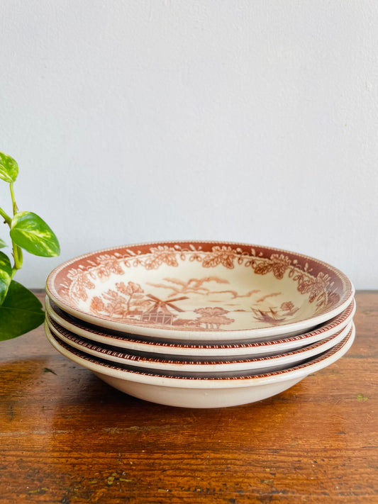 Vintage Brown Transferware Wide Bowls with Dutch Windmill, Boat, Leaves & Acorns Scene - Set of 4 - Made in Japan