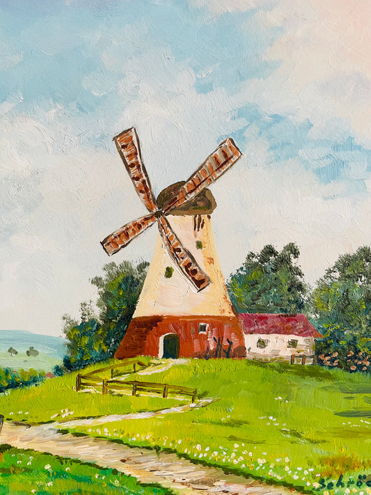Vintage 1982 Original Art Painting of Dutch Countryside Scene - Green Grass Meadow & Windmill Cottage - Artist Signed