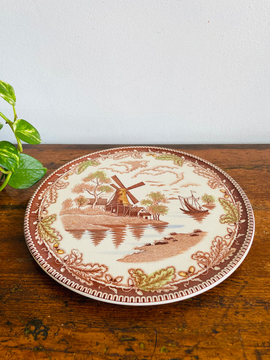 Vintage Brown Transferware Footed Cake Platter Plate with Dutch Windmill, Boat, Leaves & Acorns Scene - Made in Japan
