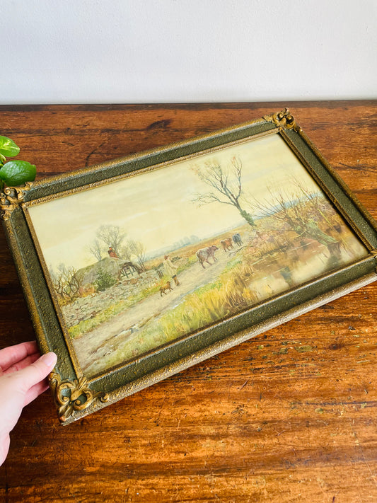 Vintage / Possibly Antique Gorgeous Print Picture in Ornate Frame by English Artist Henry John Yeend King - Pastoral Scene of Shepherd, Dog, Cows & Thatched Roof Cottage