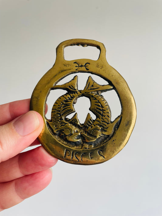 Horse Brass Medallion Hanging Wall Decor with Pisces Fish Zodiac Astrology Sign