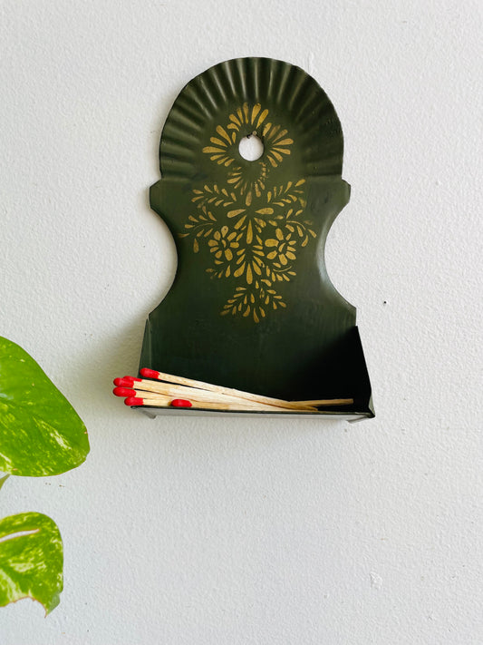 Antique 1880 Green Tin Toleware Match Safe - Wall Hanging Holder with Gold Flower Stencilled Design
