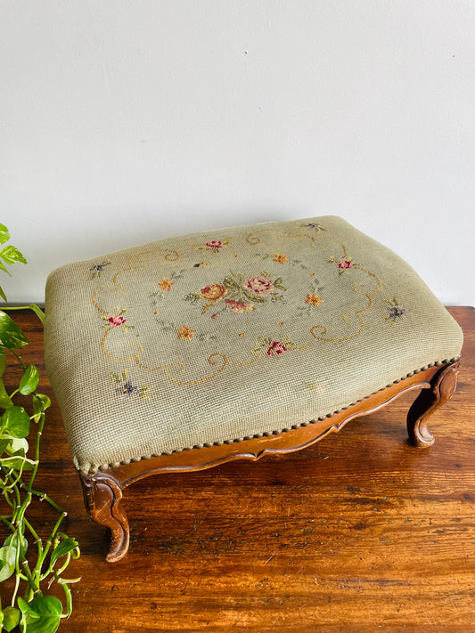 Antique Victorian Solid Wood & Floral Needlepoint Embroidery Footstool