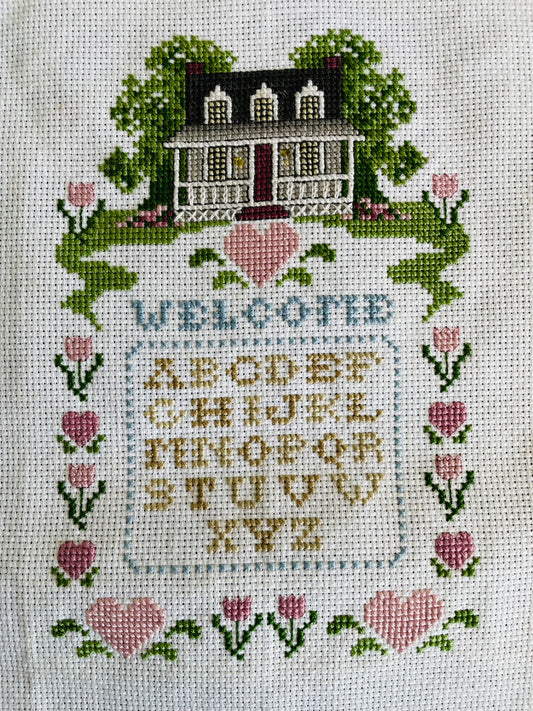 Welcome Needlepoint Embroidery Sampler with Cozy House, Hearts & Flowers