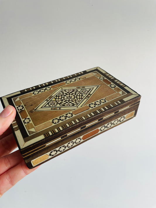 Wood Marquetry Trinket Box with Elaborate Design & Hinged Lid - Interior Lined with Felt