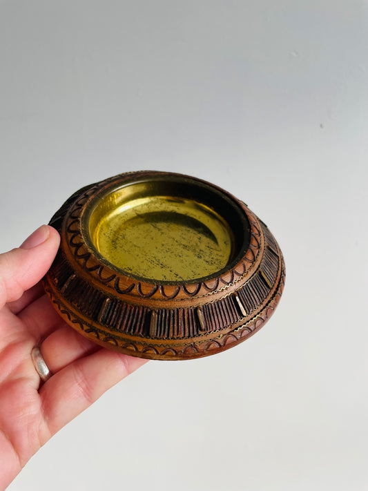 Carved Wood Trinket Bowl Dish with Inlay & Brass Insert
