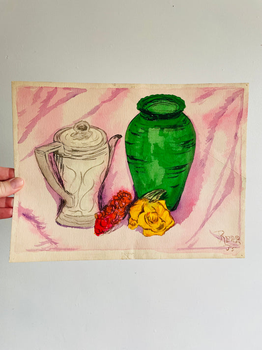 1955 Original Art Watercolour Still Life Painting on Paper - Signed Rene
