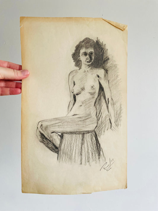 1958 Original Art Academic Nude Portrait Study Sketch on Paper of Woman - Signed Rene