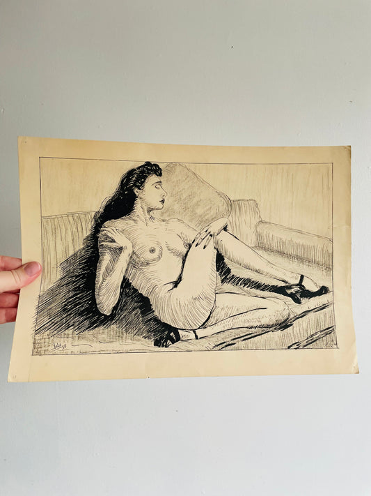 July 1955 Original Art Academic Nude Portrait Study Sketch on Paper of Nude Woman with High Heels