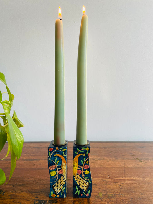 Israeli Lacquered Wood Wavy Candle Holders with Hand Painted Peacock, Lion, Deer, Bird & Flower Design - Yair Emanuel Shabbat CandlesRegular price $40.00 CADRegular priceUnit price / per-