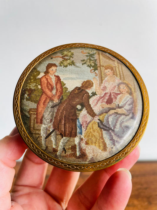 Footed Petit Point Embroidery Round Brass Trinket or Jewellery Box with Mirror InsideRegular price $16.00 CADRegular priceUnit price / per-