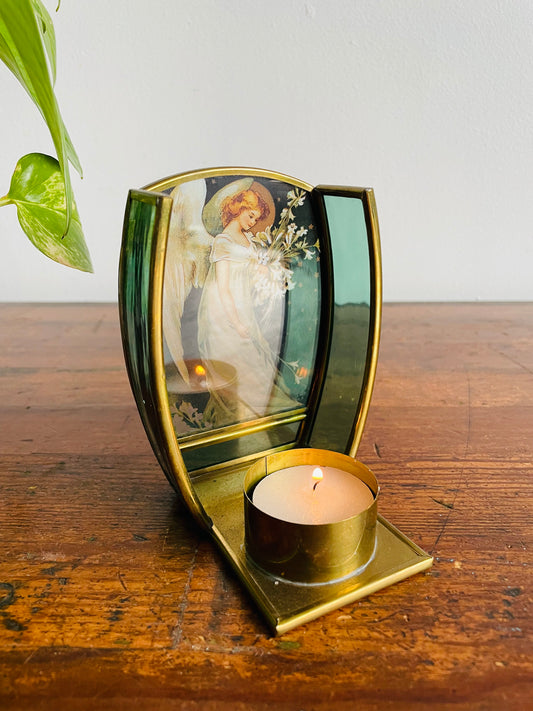 Enesco Brass & Stained Glass Tealight Candle Holder with Angel Holding Lily Flowers - Made in Mexico