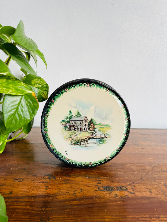 Quaint Country Grist Mill Cottage Scene Round Biscuit Tin with Lid