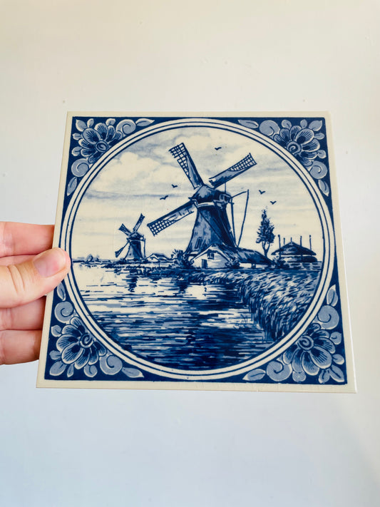 Vintage Delft Blue Dutch Windmill Hand Painted Tile - Can Hang on Wall - Made in Holland
