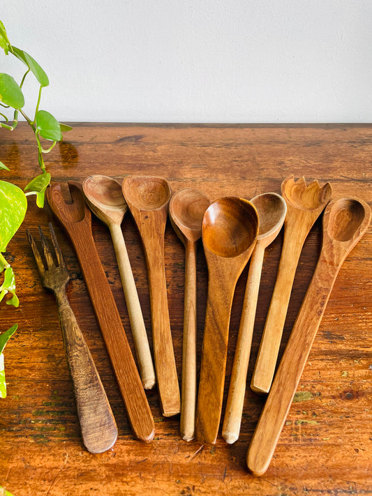 Vintage Collection of Wood Spoons & Serving Utensils - Includes 9 Pieces - Great for Kitchen or Staging!