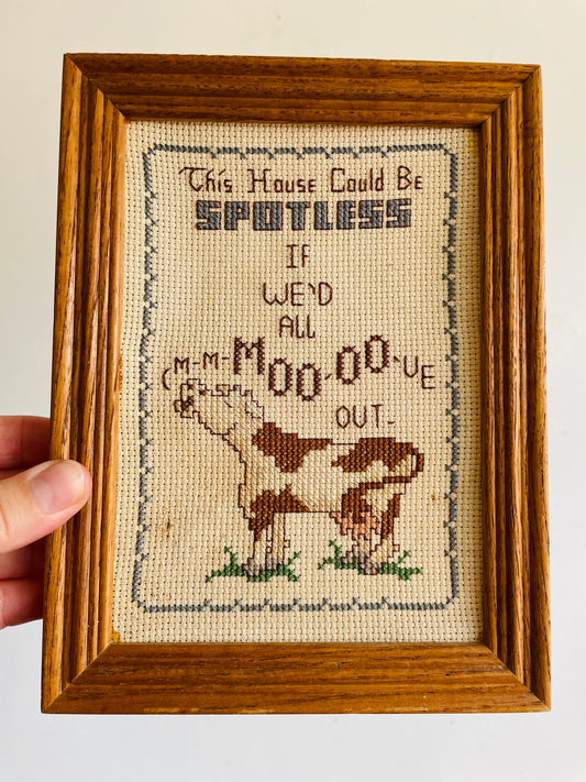 Vintage Cow Embroidery Picture - This House Could Be Spotless If We'd All M-M-MOO-OO-VE Out
