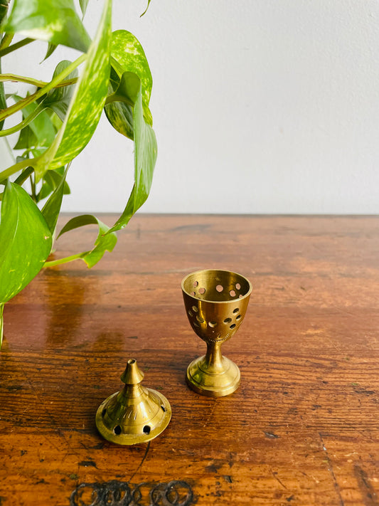 Solid Brass Mini Goblet Shaped Incense Burner with Stem and Lid