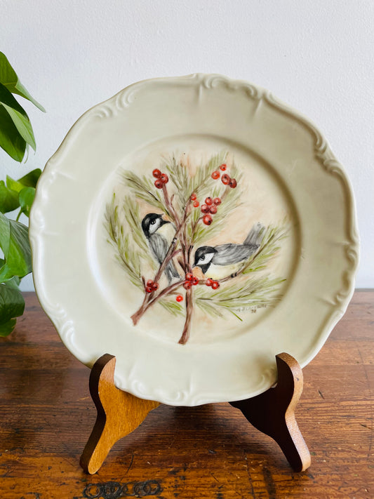 Edelstein Bavaria Maria-Theresia Germany Plate - Hand Painted with Chickadee Bird Winter Scene by A. Blackburn in 1978 - Updated: Plate Hanger Now Included