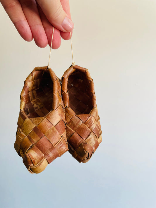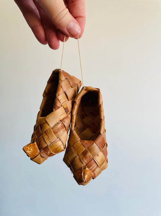 Finnish Birch Bark Woven Wood Shoes # 1 - Set of 2 Hanging on Rope