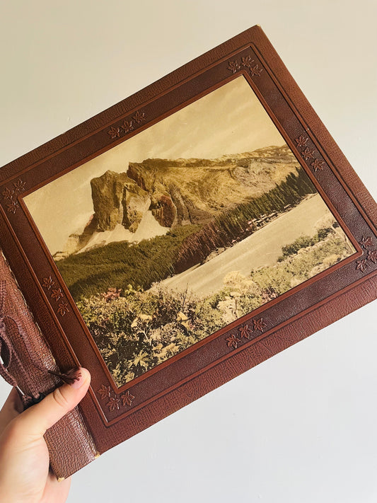 Antique Photo Album or Scrapbook - Brown with Embossed Maple Leaves & Landscape Photo of Mountain with Cabins - Black Pages - Empty