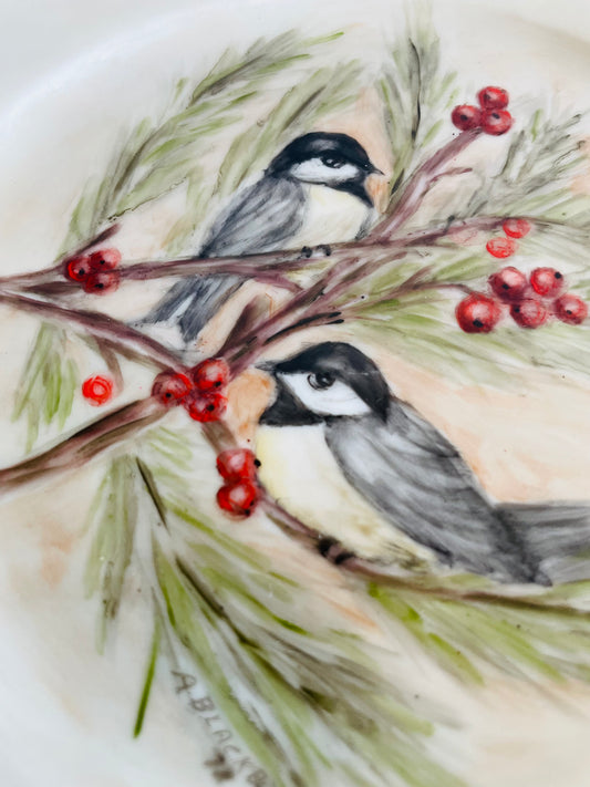 Edelstein Bavaria Maria-Theresia Germany Plate - Hand Painted with Chickadee Bird Winter Scene by A. Blackburn in 1978