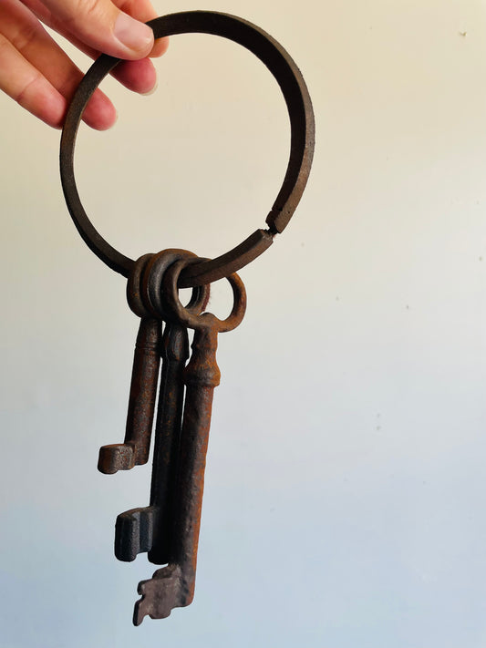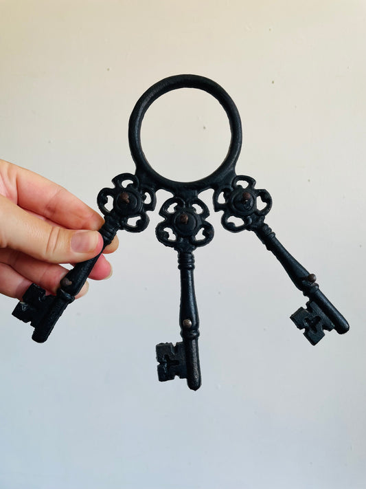 Cast Iron Oversized Set of 3 Skeleton Keys on Ring Holder