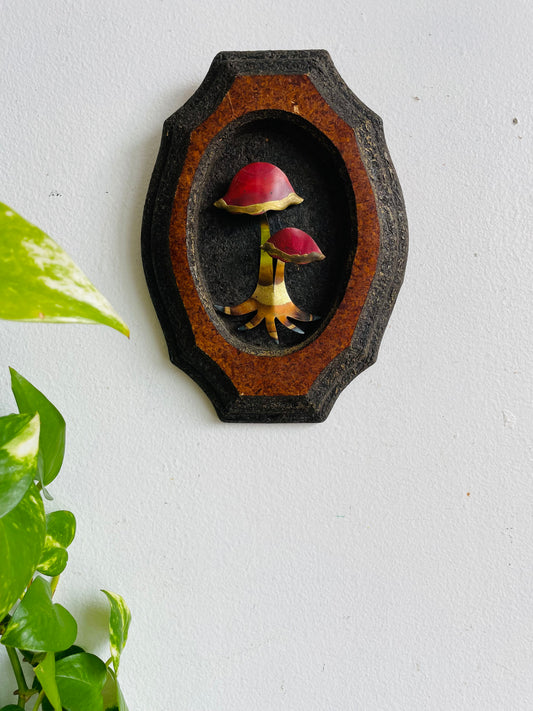 Vintage 1970s MCM Pressed Wood & Brass 3D Mushrooms Wall Hanging Plaque Picture