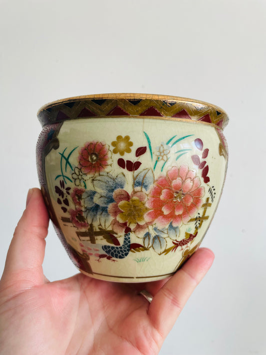 Vintage New England Pottery Ming Dynasty Fishbowl Planter Pot - Burgundy, Gold & Blue Muted Floral with Bird Design