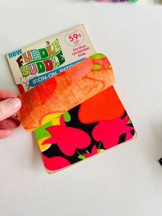 Vintage Groovy Sewing Notions Bundle - Peace, Flower Power, Butterfly, Stars & Shapes Buttons - Fuddle Duddle Floral Iron-On Patches - Rainbow Rick Rack - Bright & Fun!