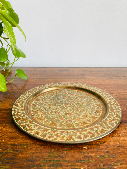 Vintage Round Enamelled Brass Tray with Floral Design - Great for Decor, Serving, Vanity, Bathroom, Etc.