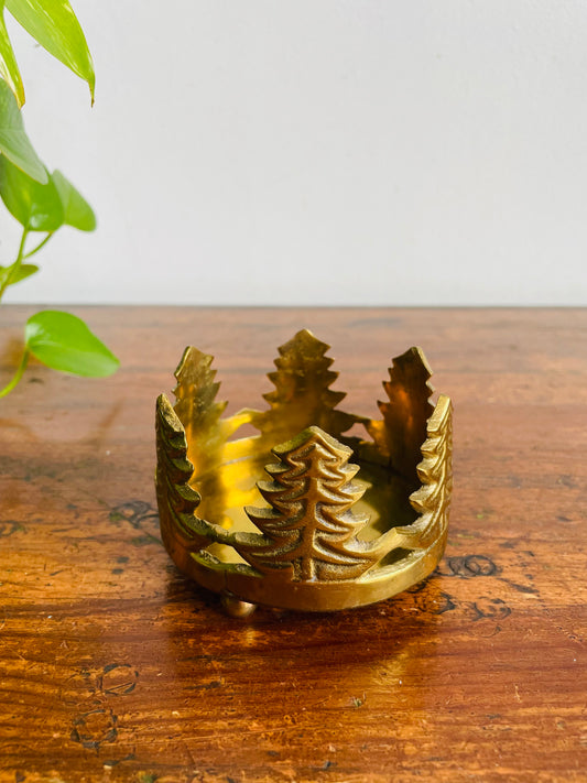 Vintage Round Solid Brass Footed Pillar or Tealight Candle Holder or Trinket Dish with Tree Design - Made in India