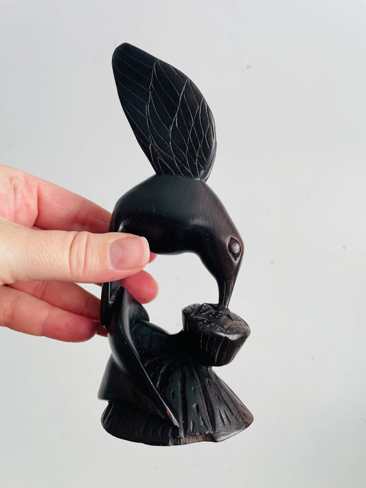 Vintage Hand Carved Dark Wood Hummingbird & Flower Sculpture