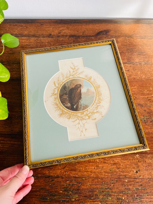 Vintage Illustrated Print Picture of Golden Eagle Bird with Chicks in Nest Overlooking Mountains - Gold Frame & Details, Unique Mat & Professionally Framed - Stunning Colours!