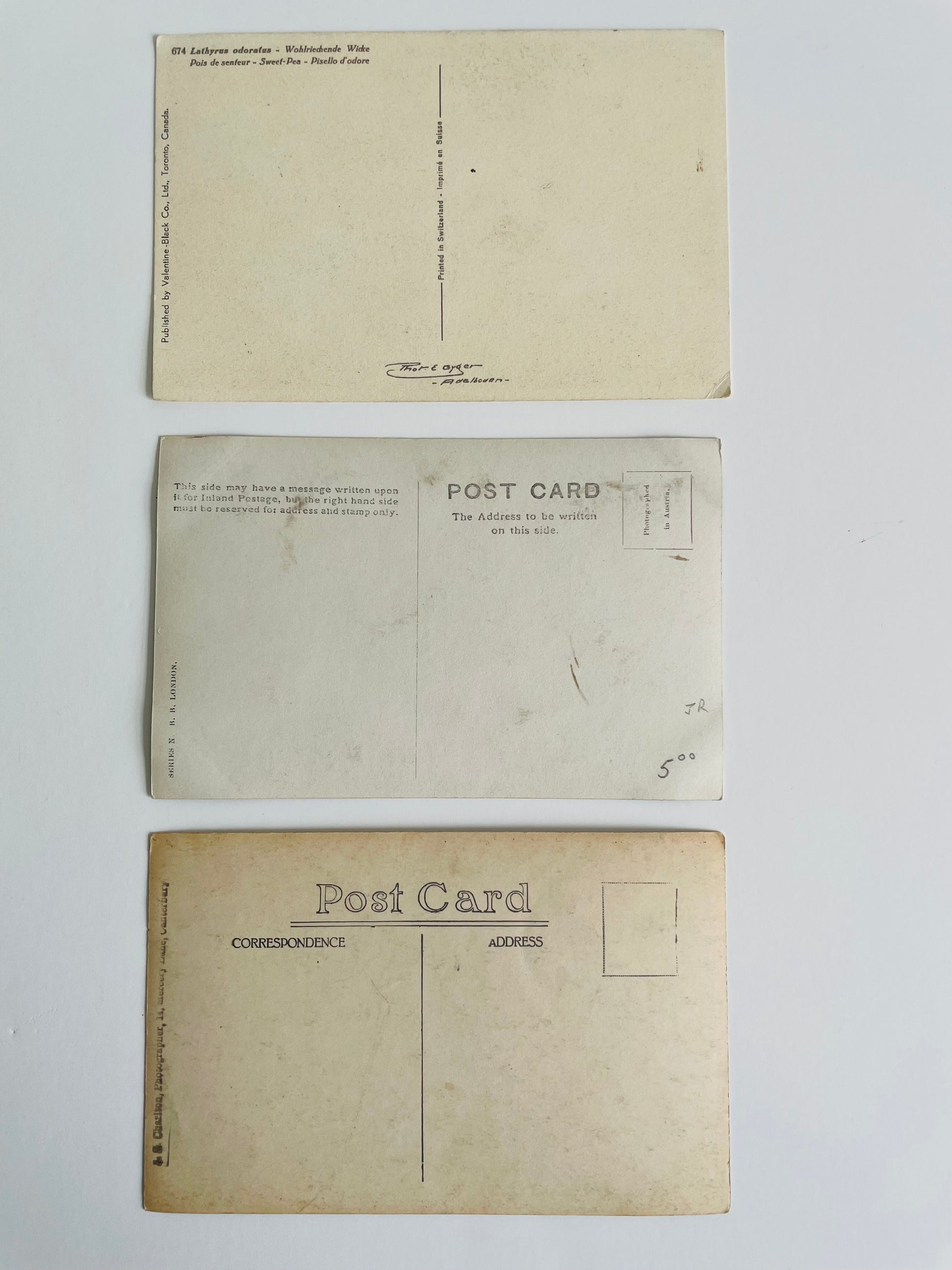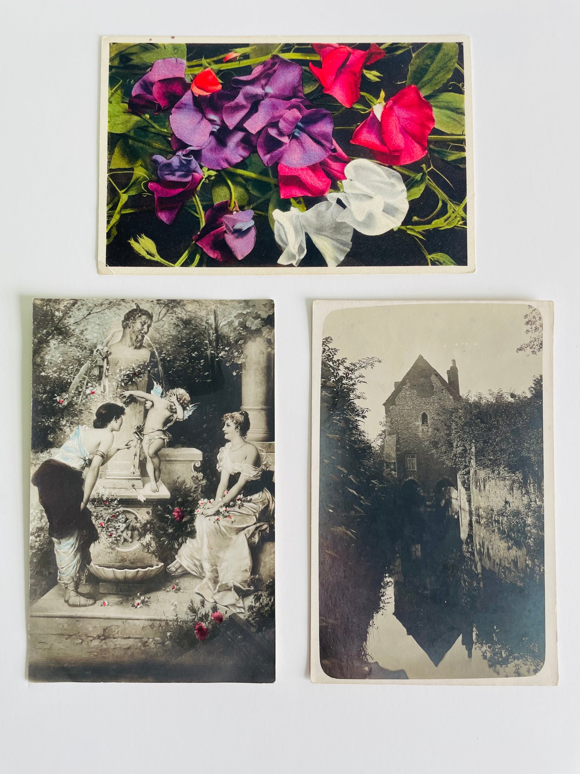 Early 1900s Postcard Collection - Greyfriars in Canterbury, Sweet Pea Flowers & Women with Cupid at Fountain - Set of 3