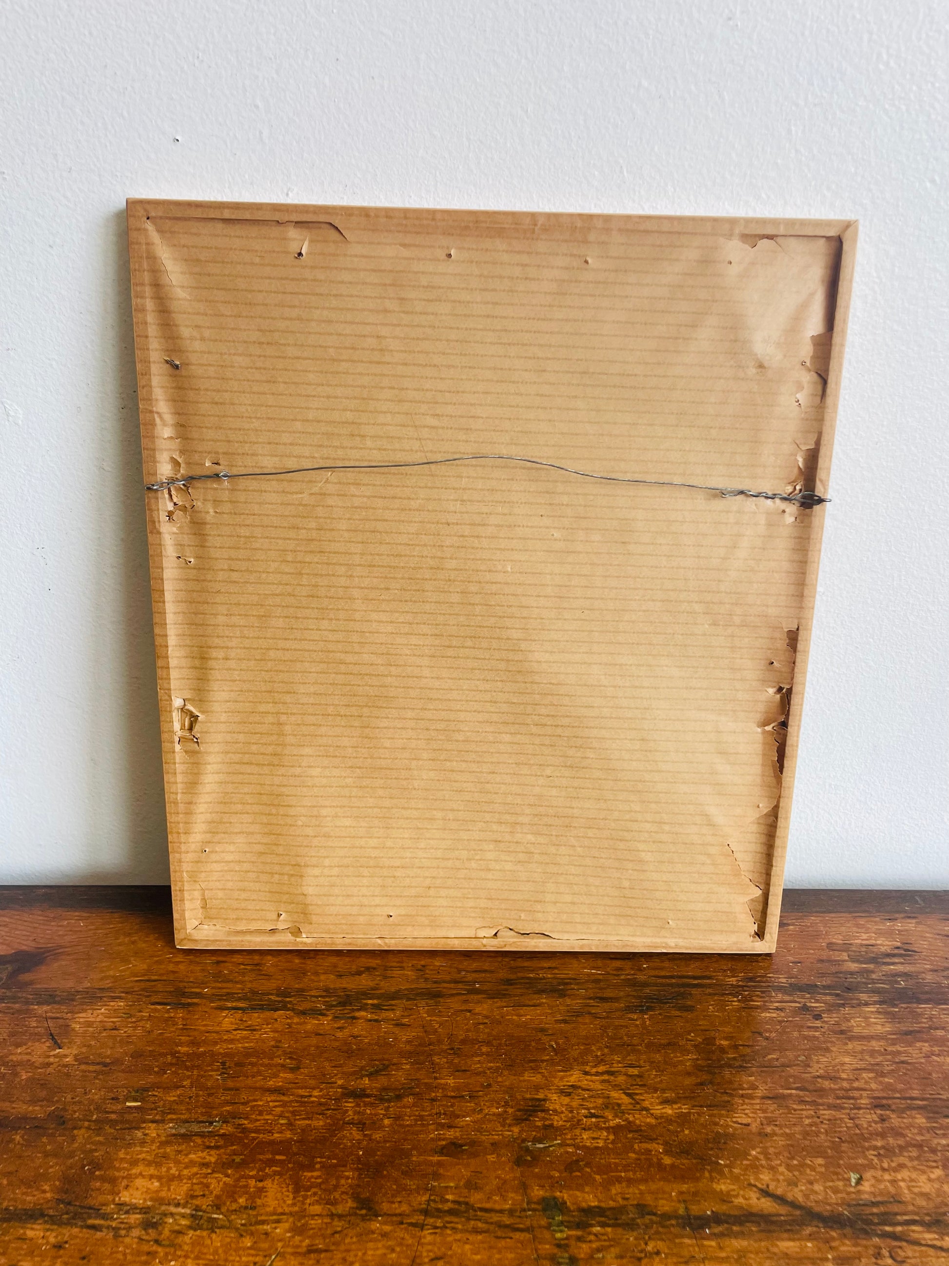 This print sits in a wood frame, behind glass. There is a wire on the back from hanging.