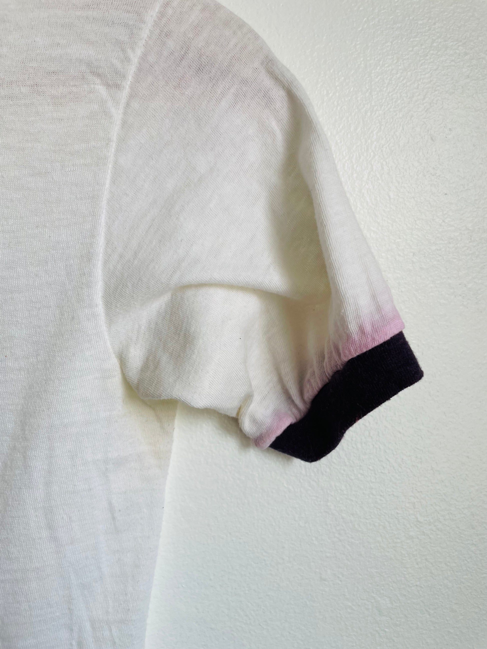 Note: There are some marks on the shirt and I have done my best to photograph them all. I didn't use any brightening products on the yellowing on the arms but you might be able to reduce the marks. They aren't extremely dark but they are there. You can also see that the purple from the ring bands on the sleeves and neck has bled into the surrounding shirt areas. See photo gallery. The price is reflective.