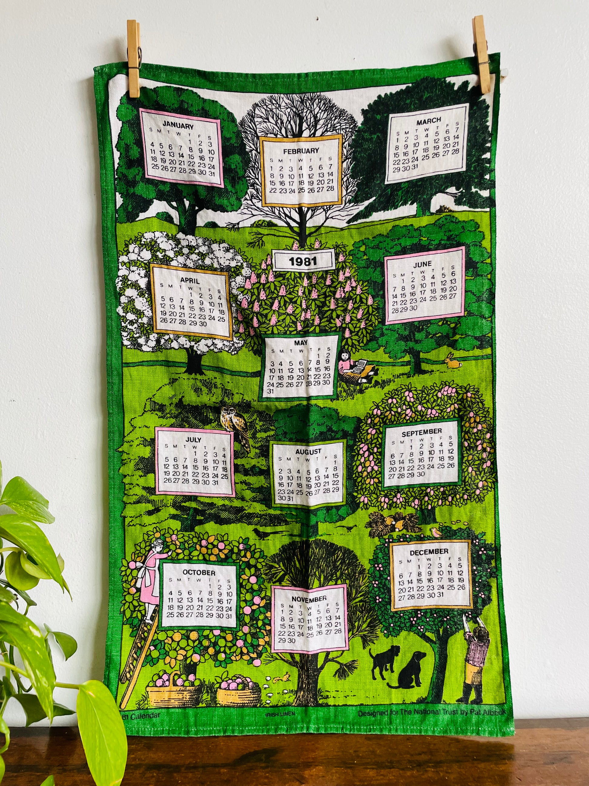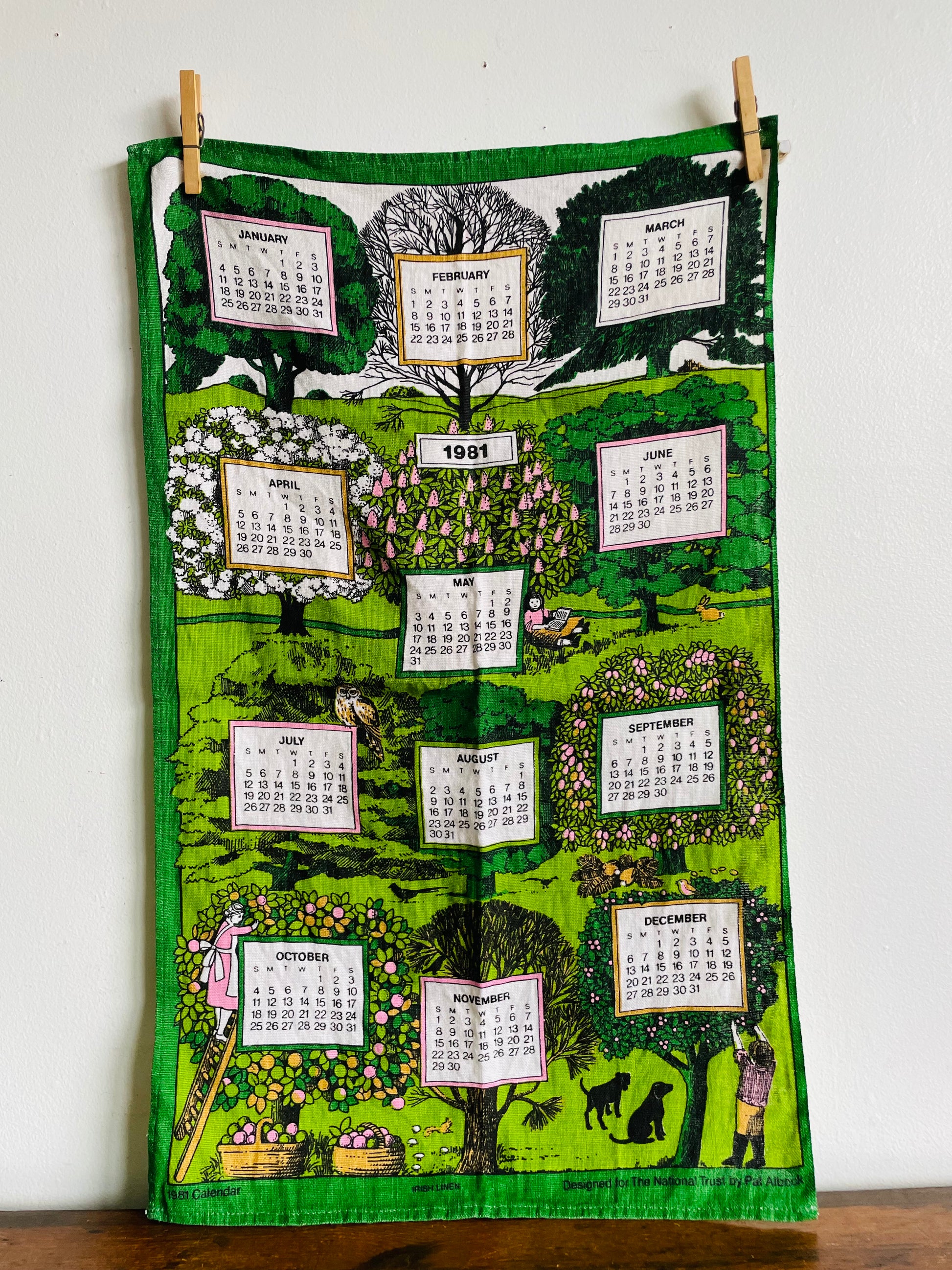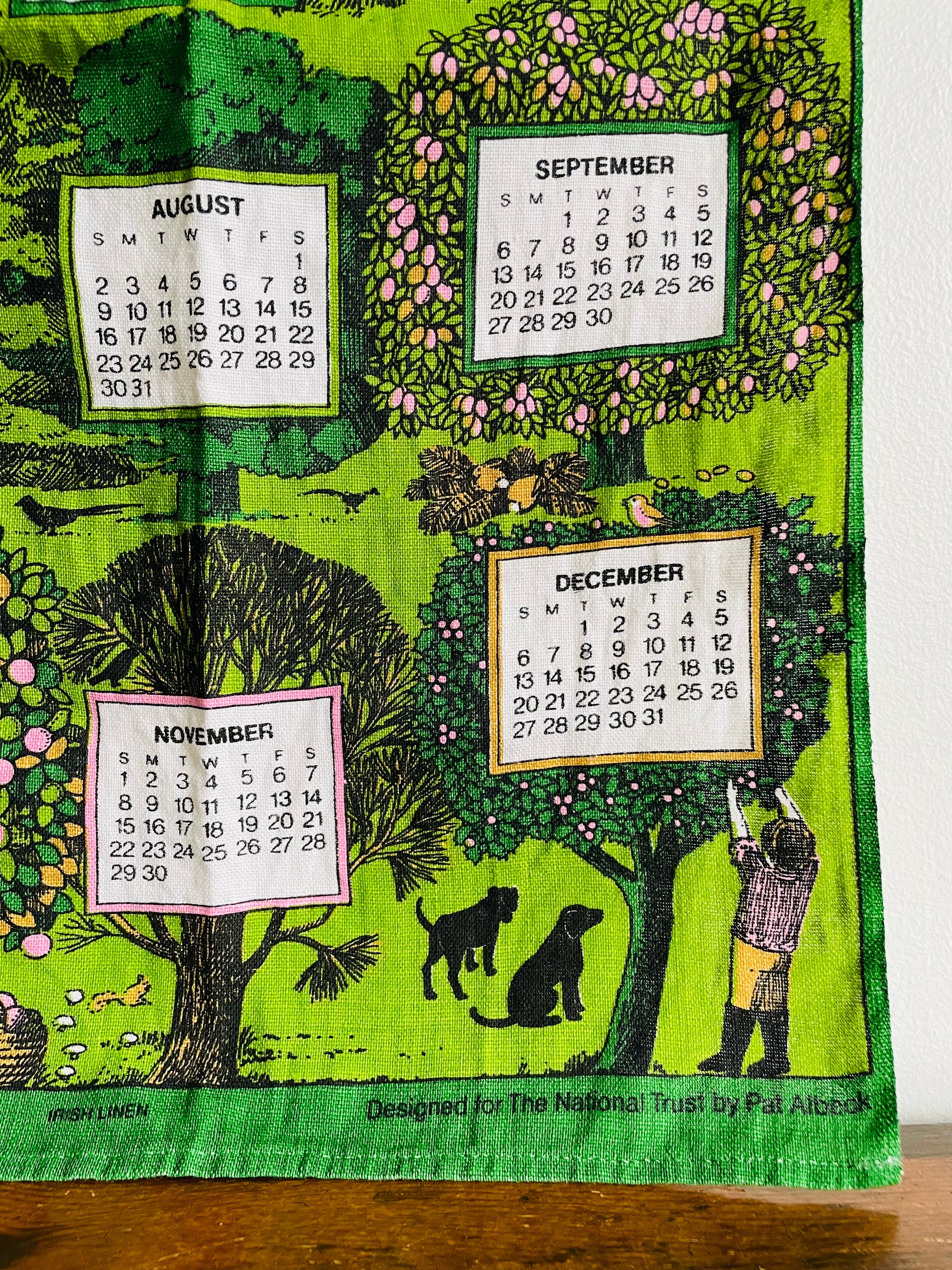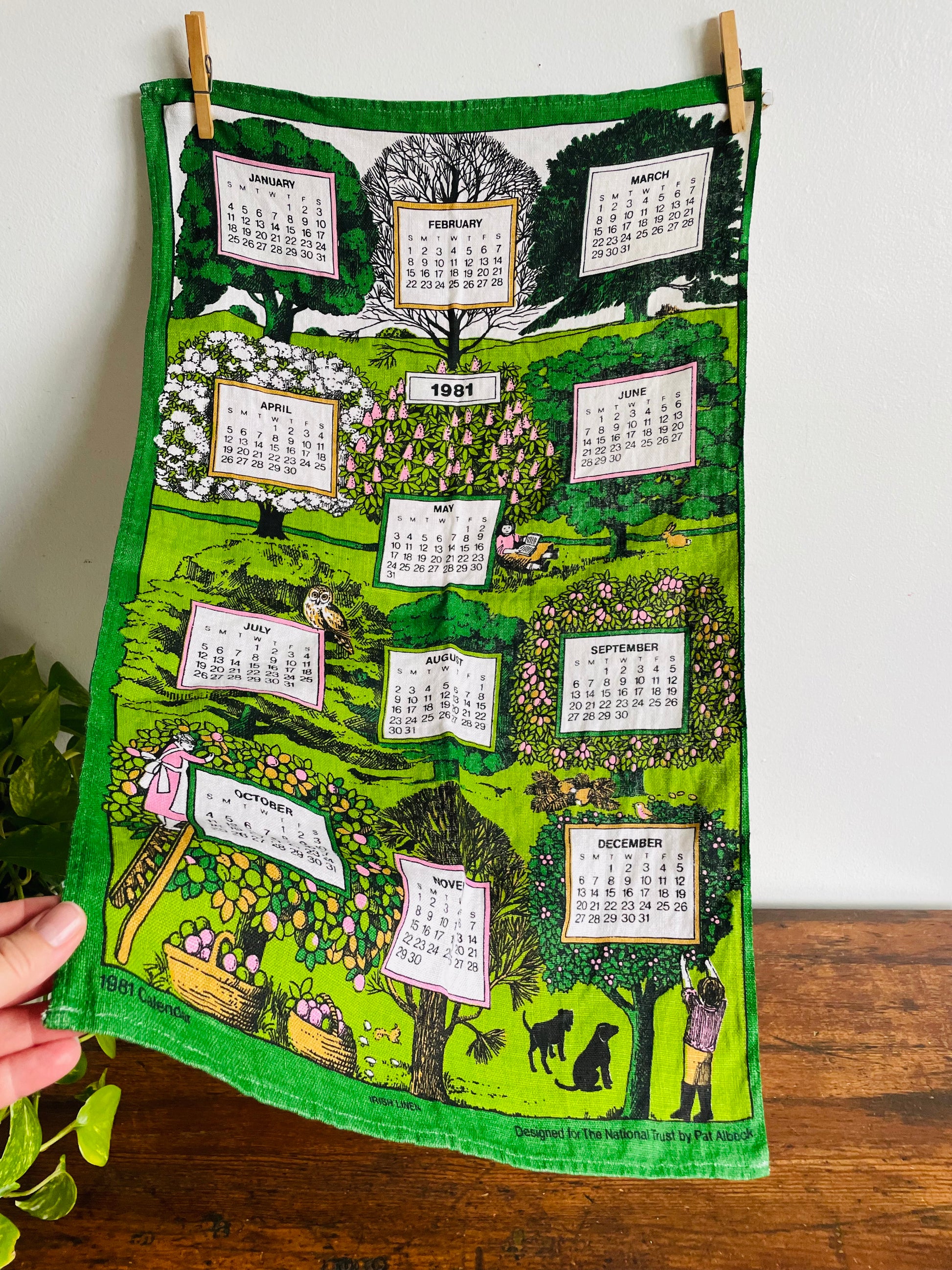 1981 Calendar Irish Linen Tea Towel with Adorable Garden Scene - Designed for the National Trust by Pat Albeck