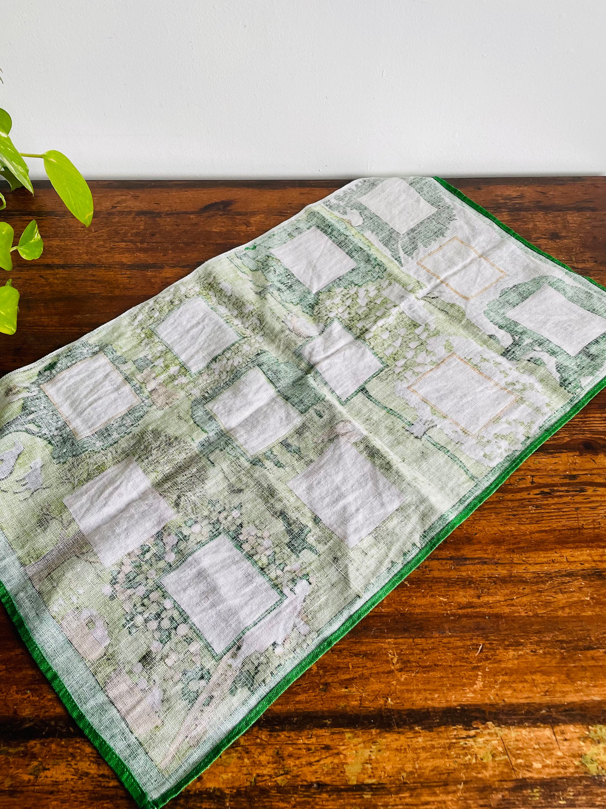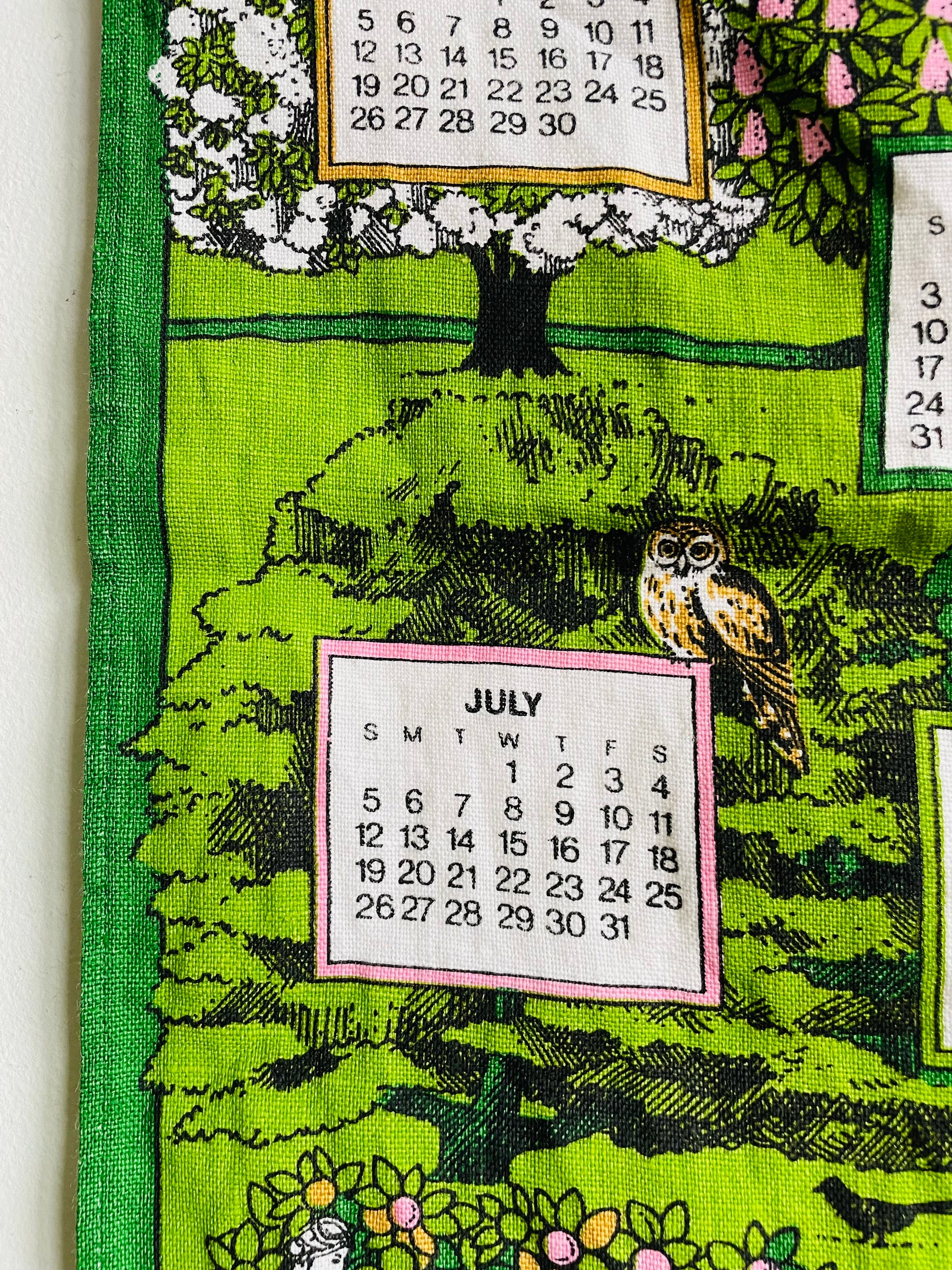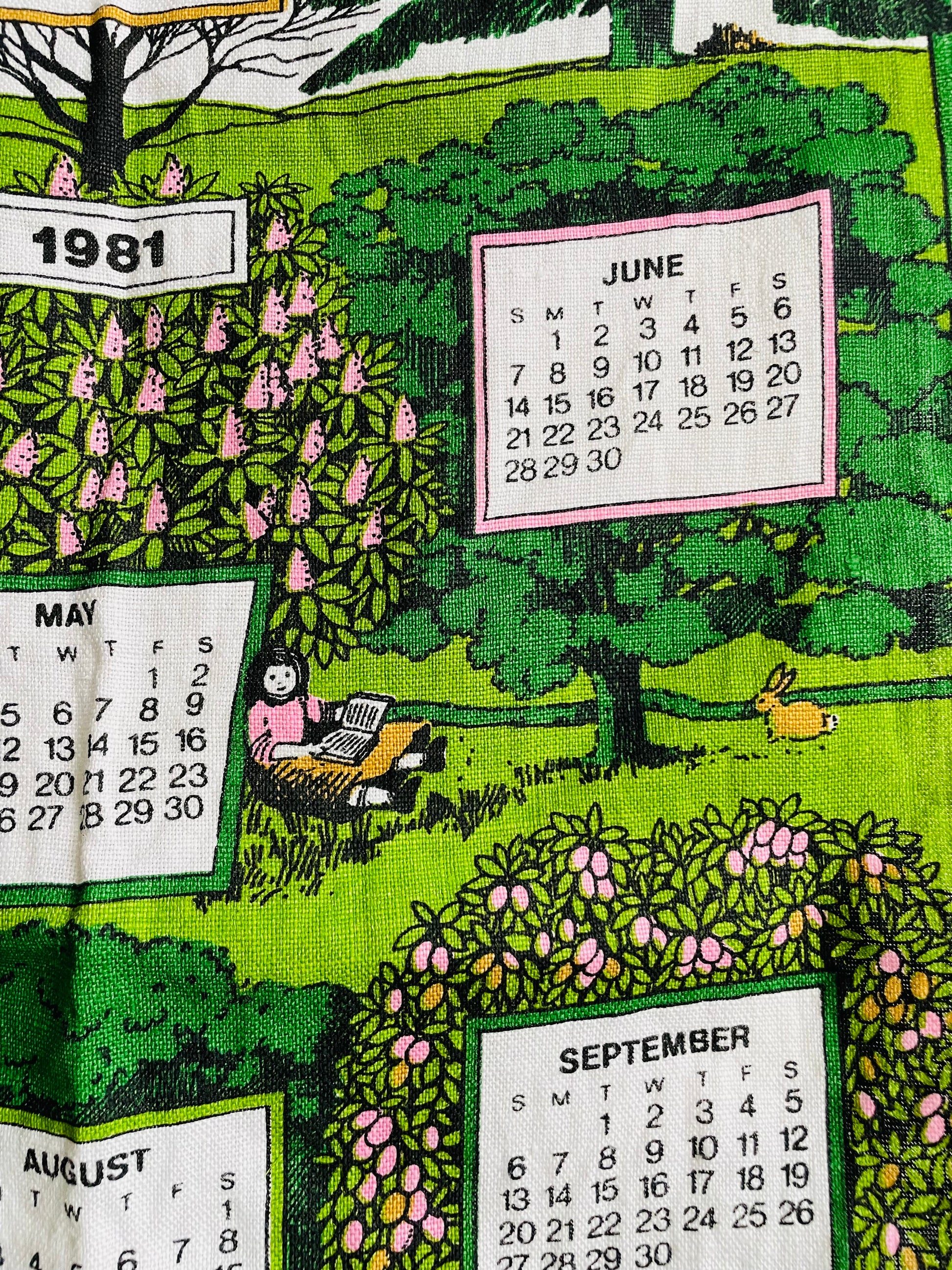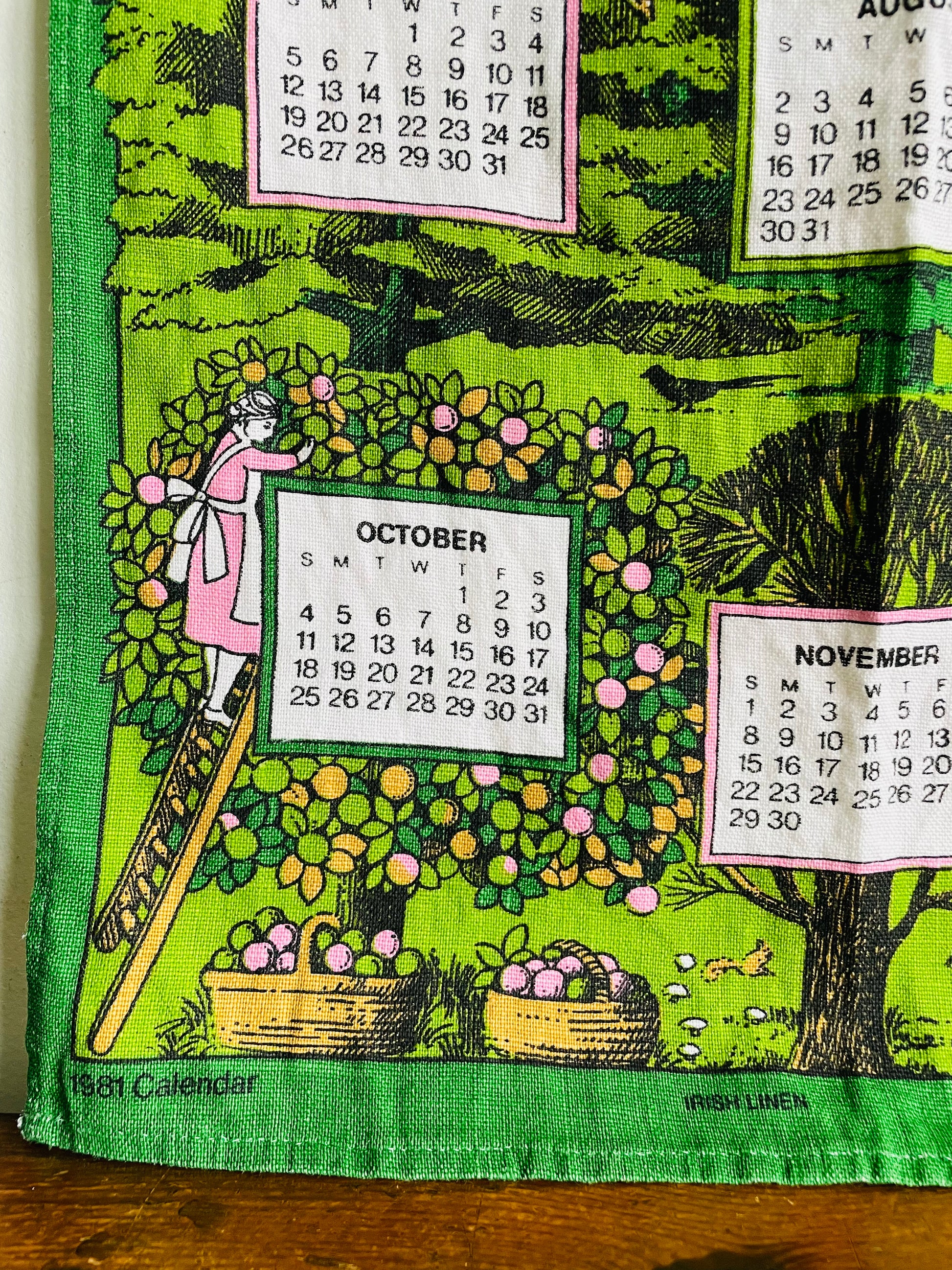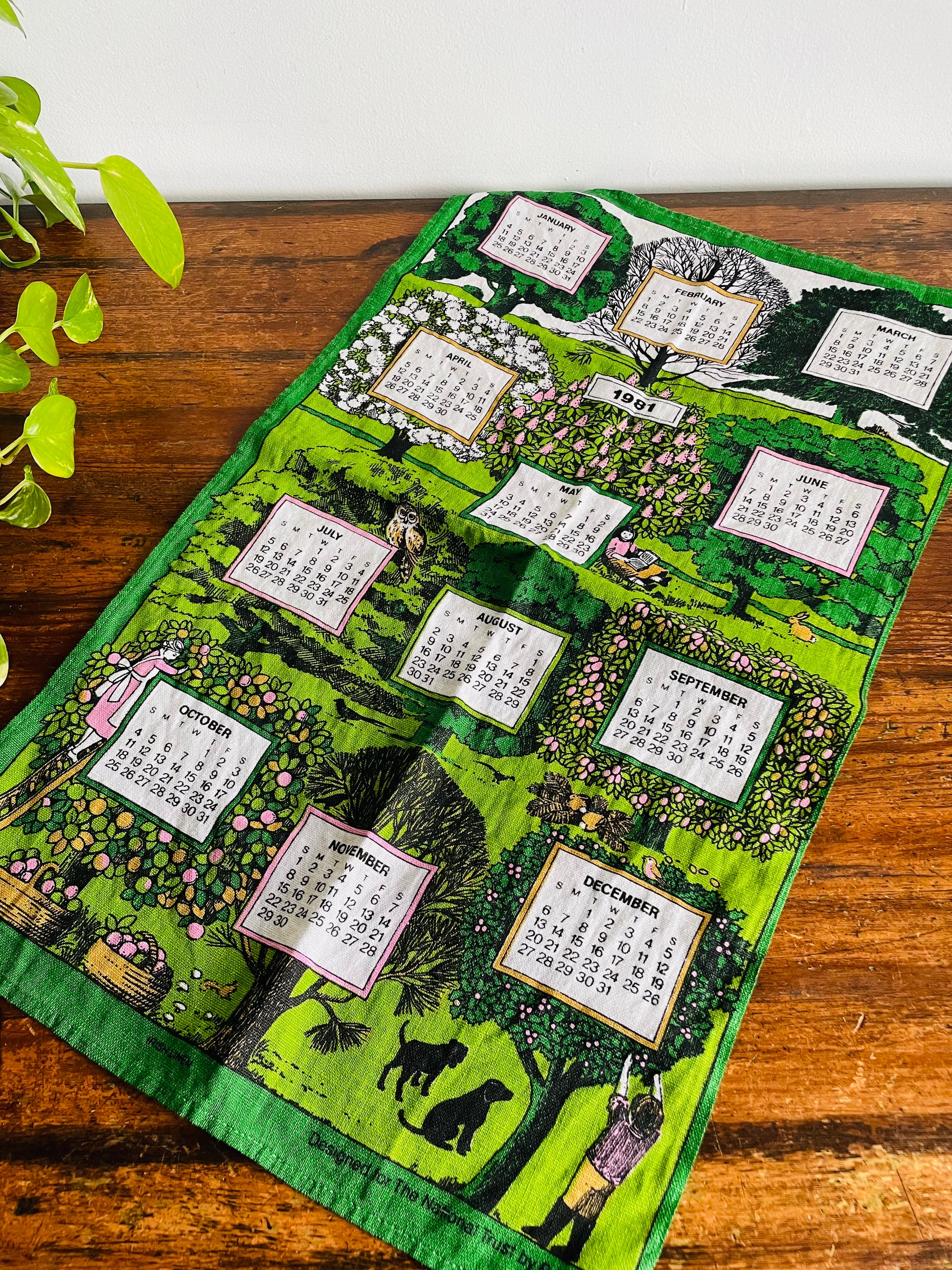 1981 Calendar Irish Linen Tea Towel with Adorable Garden Scene - Designed for the National Trust by Pat Albeck