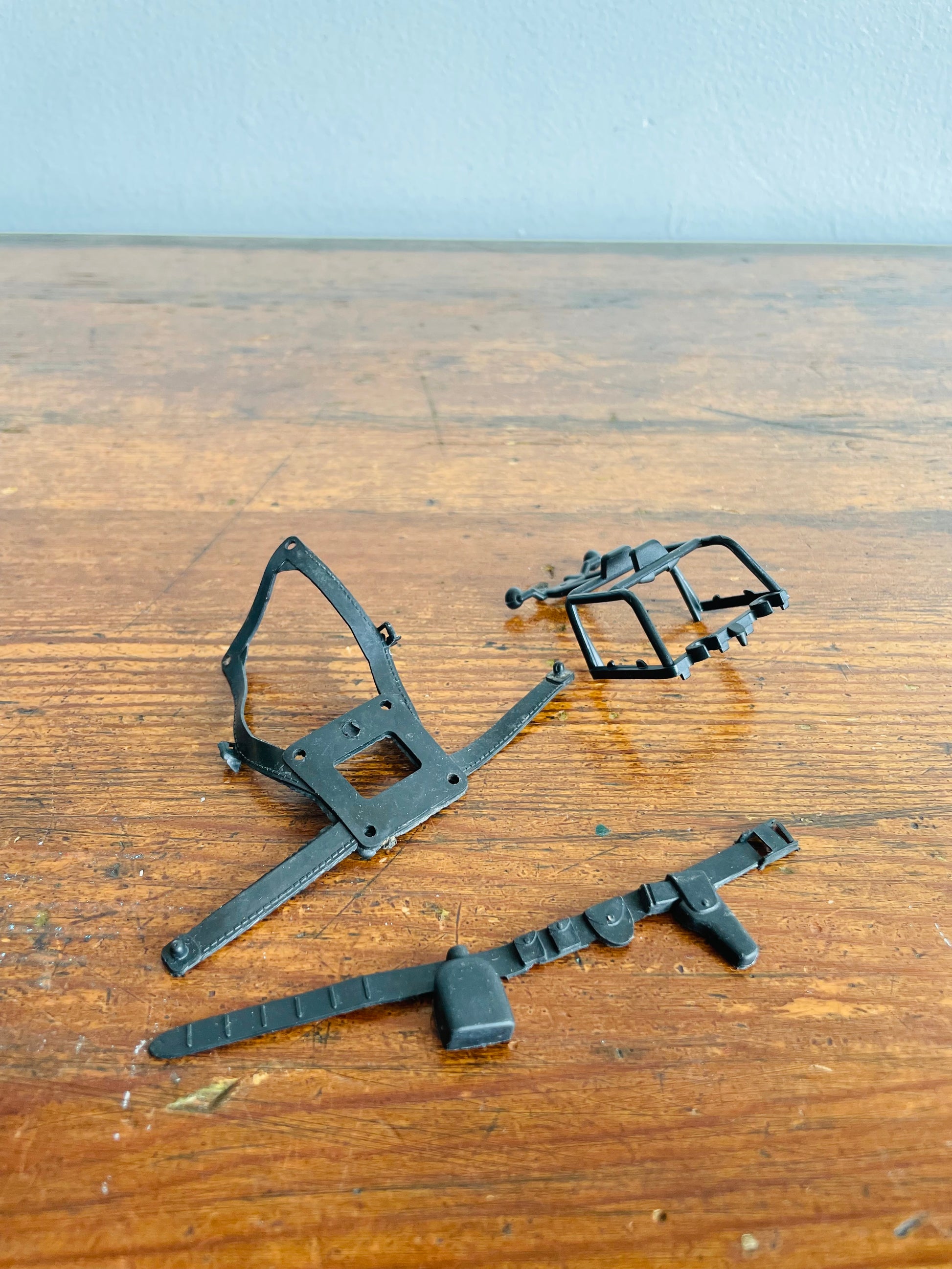 I think for sure the two rubber accessories are parts that go with the figure but I'm not sure about the harder plastic part that looks like the top of a jeep. However, I'm including it as it came with the same toy together.